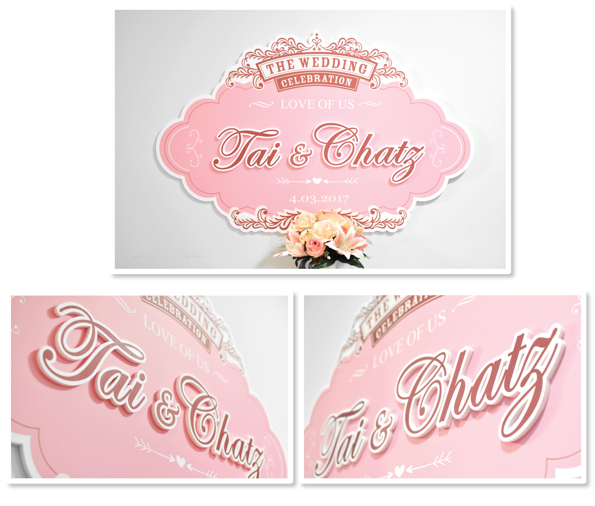 ป้ายชื่อคู่ (ชื่อเล่น) เจ้าบ่าวเจ้าสาว เป็นป้ายแบบมีมิติ ไดคัทเล่นระดับของชิ้นงาน ทำให้ดูสวยโดดเด่น ใช้ในงานพิธีหมั้น พิธีแต่งงาน ใช้ได้ในงานทั้งช่วงเช้าและช่วงเย็น